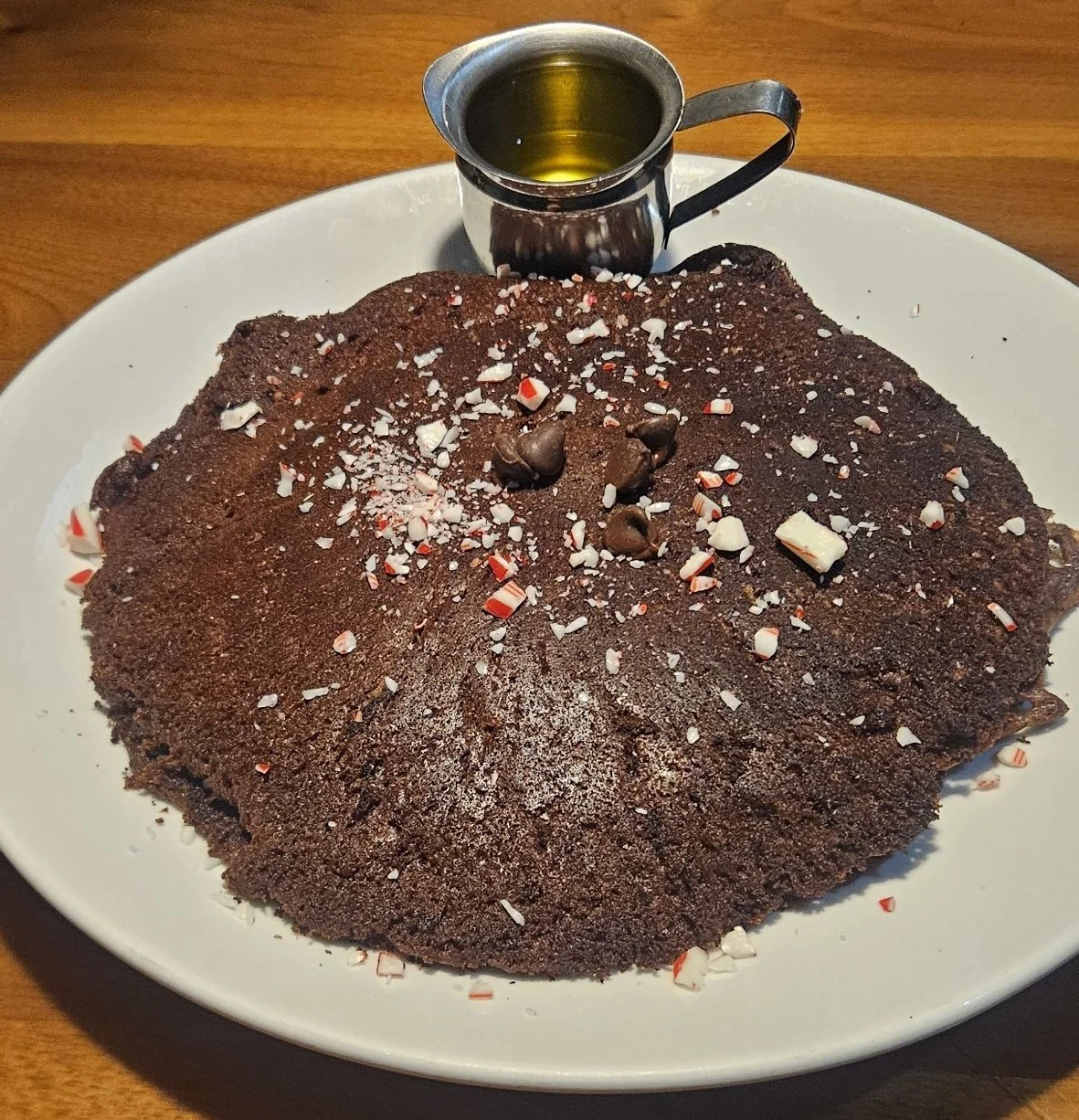 House made mix with organic flour, dark cocoa and peppermint extract. Chocolate chips inside and on top with candy cane crumbles. 1 - 6.50 2- 11.50 3 - 13.50