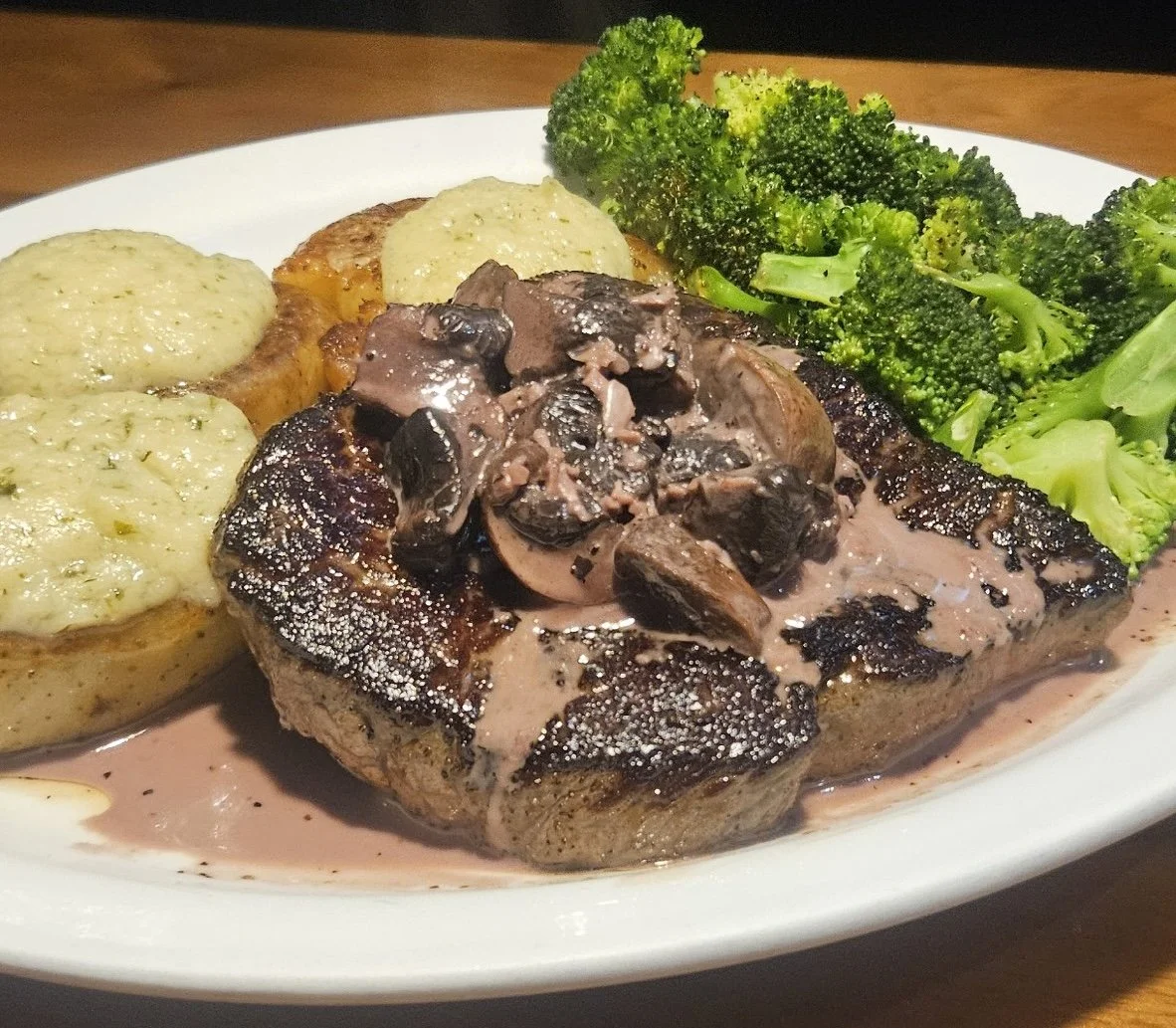 An 8oz cut of marbled wagyu sirloin grilled to perfection and topped with our amazing reduction of hearty red wine, garlic, portabella mushrooms, cream and love. Served with crispy garlic potatoes and organic broccoli. 40