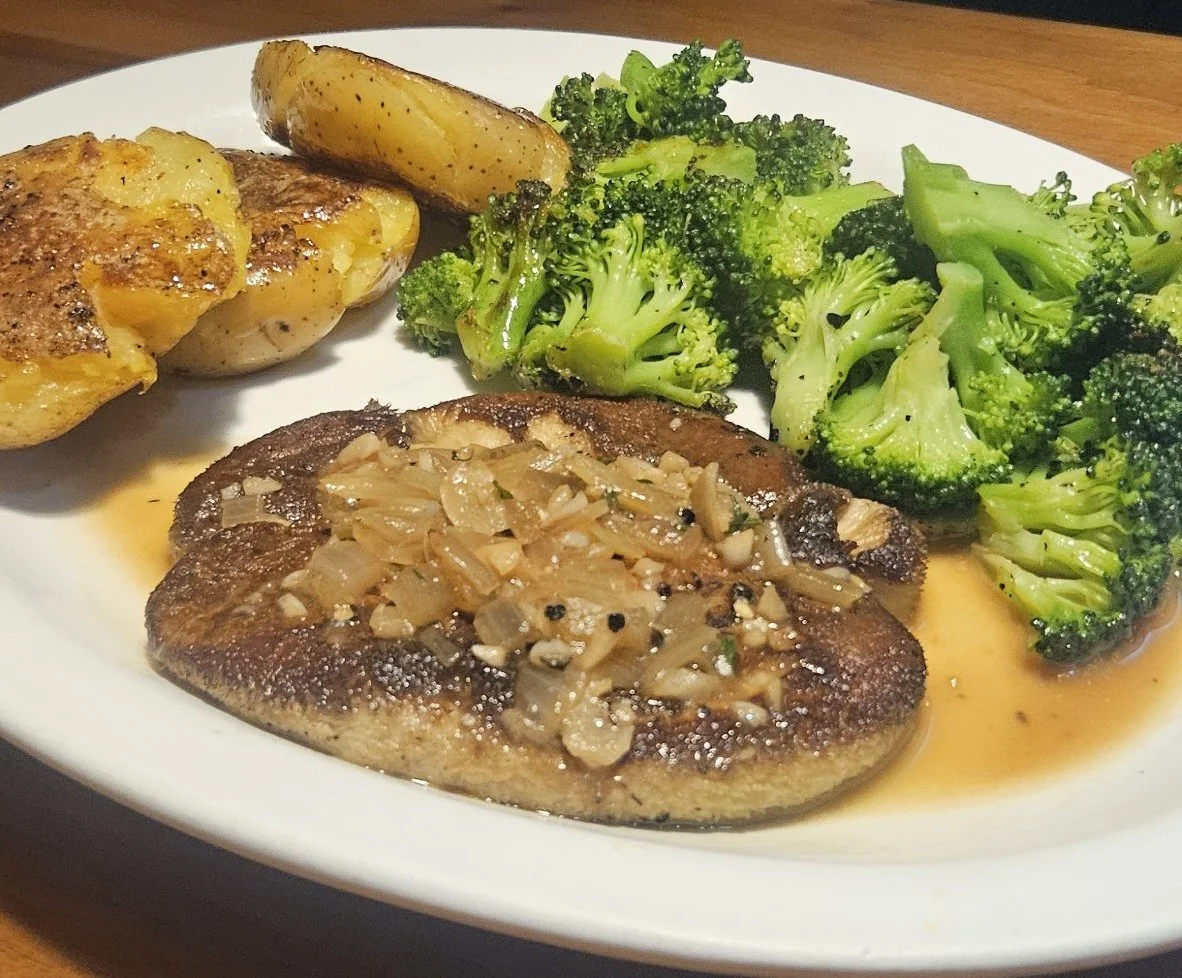 Lion's Mane mushrooms grown locally at Guided by Mushrooms farm are grilled under a weight until browned, juicy and tender. Finished with a vegan take on a classic French Au Poivre sauce made by reducing garlic, onions, black pepper, herbs, cognac, rich stock and vegan butter. Served with crispy garlic potatoes and organic broccoli. 24