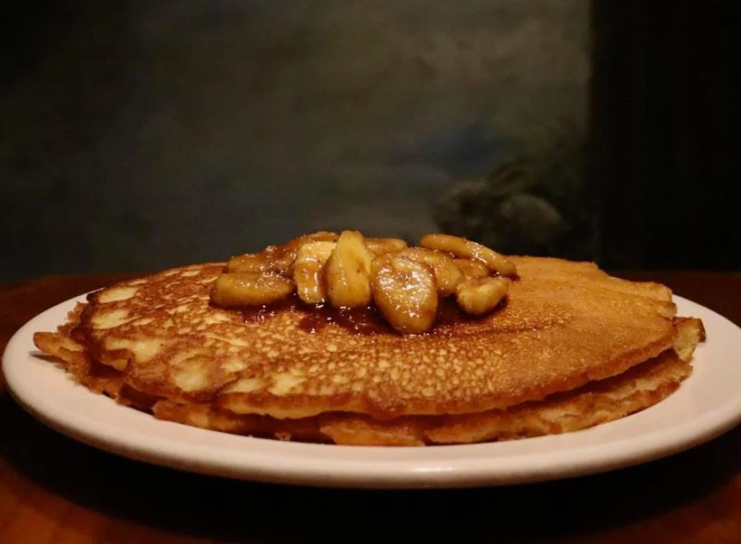 Our famous crispy-edged buttermilk pancakes topped with bananas caramelized in butter, brown sugar, cinnamon, maple syrup and rum.