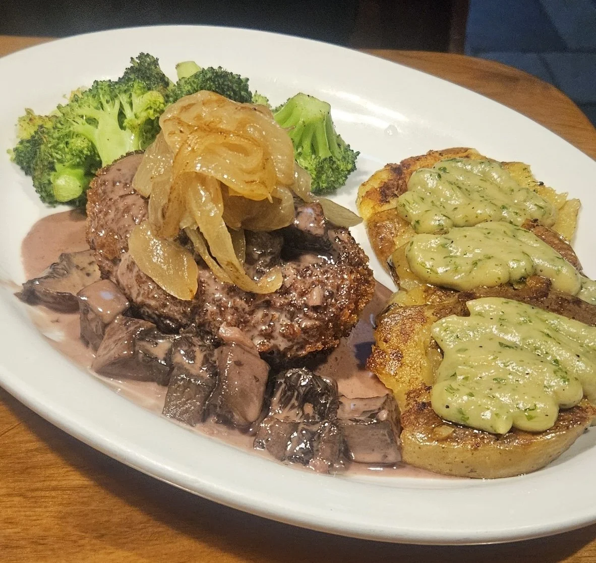 Local ground beef from Flying Mouse Farm and local pork from Grant’s Family Farm are mixed with a reduction of shallots, red wine, truffle oil, bread crumbs, organic eggs, fresh herbs and spices. Served with crispy garlic potatoes and organic broccoli. Topped with caramelized onions. Finished with a reduction of mushrooms and port wine. 28